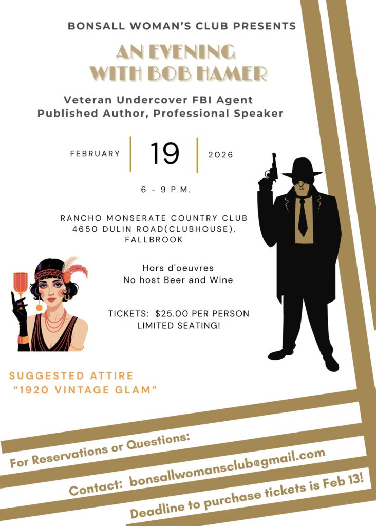 The Bonsall Woman's Club invites you to an evening with Bob Hamer. Bob is an author, retired undercover FBI Agent and speaker. He will be in our Clubhouse on February 19th for a casual fun evening. The tickets are $25 and we would love to have you join us. Limited seating so if you would like tickets you can get with me to reserve or email the club at bonsallwomansclub@gmail.com.